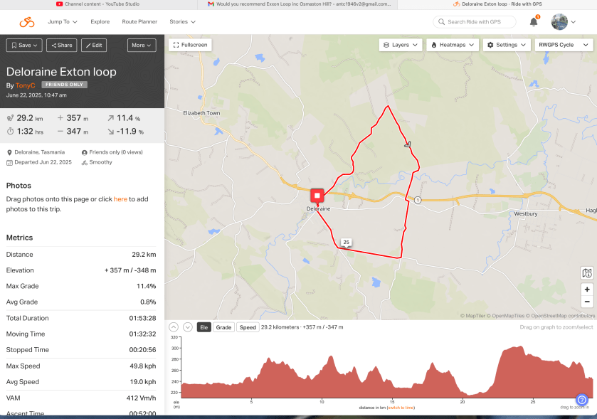 The Deloraine / Exton / Deloraine loop has a good number of hills and made a good test.