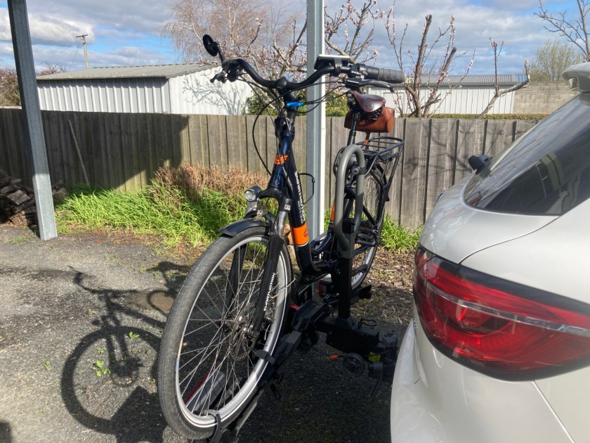 E-City sits in the rack comfortably attached as per normal by a clamp from the central frame plus ties for the wheels. There is also a strap supplied (reminding me of “belt and braces”). I couldn’t make the strap fit and didn’t have a longer one so forgot about it.