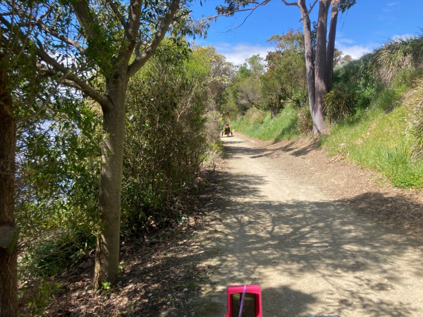 Then we continued up to Gutteridge Gardens through which the pathway, in a gravel form, now continues to Fossil Bluff. Some really nice sections had us riding between the Inglis river with it’s remnant bush and established gardens on the other side. In places the trail was a bit bumpy for trikes and some of the steeper bits had the back wheels spinning but the views made it worthwhile.