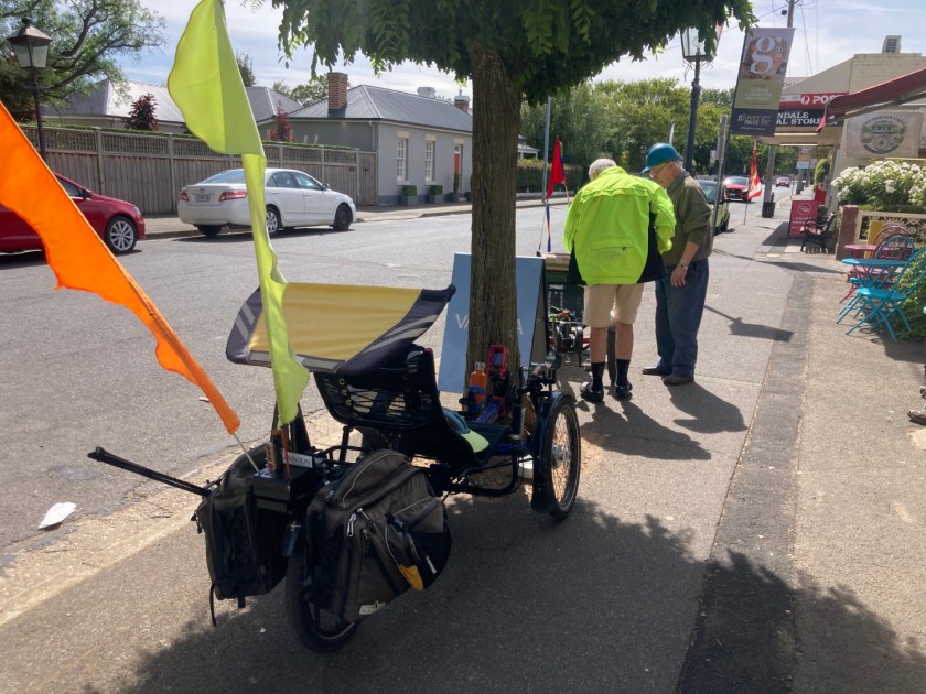 Early in February Colin and I rode the trikes over to Evandale. It’s a good ride except for the 2 kilometres on the Midland Highway. Good both for the rural roads with scenic views and the fact that there is a cafe in Evandale which makes good coffee.