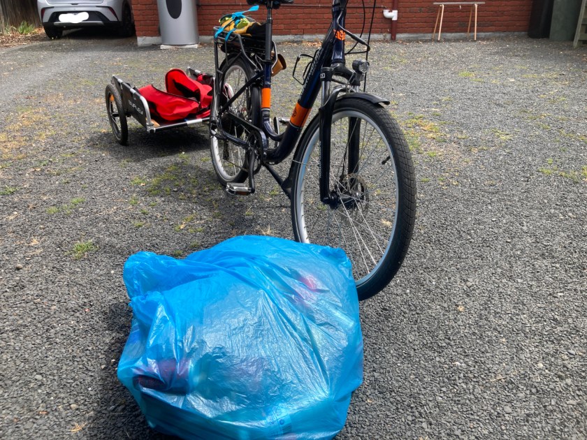 As we cycled to Evandale we noticed a large build-up of roadside treasure. A few days later we decided to ride out to the Midland Highway and clean it up. Well, cans and bottles only – the Pringles tubes, soft drink cartons and “disposable” coffee cups take up a lot of room with no financial return!